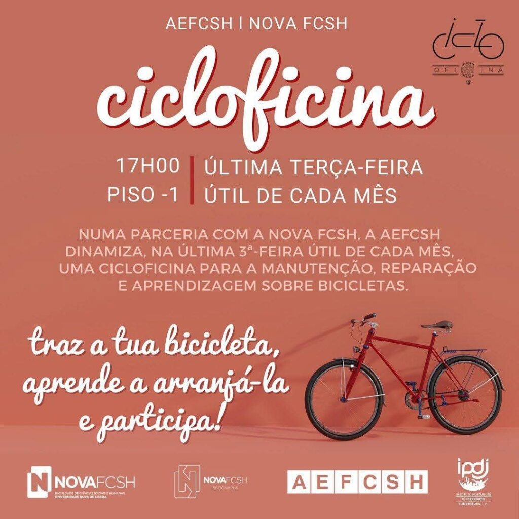 Numa parceria com a NOVA FCSH, a AEFCSH dinamiza, na última 3ª feira útil de cada mês, uma cicloficina para a manutenção, reparação e aprendizagem sobre bicicletas.